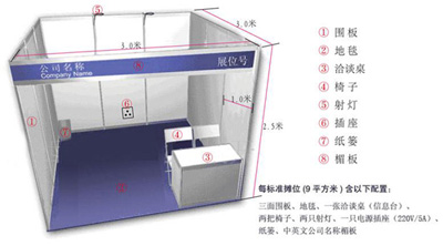 標準展位簡稱標攤,是指使用統一材料,按規定的標準模式統一搭建的展位,標準展位常見的面積有兩種:3m×3m,3m×6m。也有個別展會對標準展位設置為12平方米(3m×34m)。標準展位的特點是成本低,方便,無需參展商自己制作。組展方會搭建好展位,并將展具配備好(展具一般包括:展位楣板、一桌兩椅、射燈、插排、地毯等),參展商只需要制作展板上面的海報,或者增租一些展具即可。標準展位的缺點是展位造型固定,展示效果低,位置沒有特裝展位好。標準展位比較適合首次參展、參展預算或管理資源有限或著重控制成本的參展商。